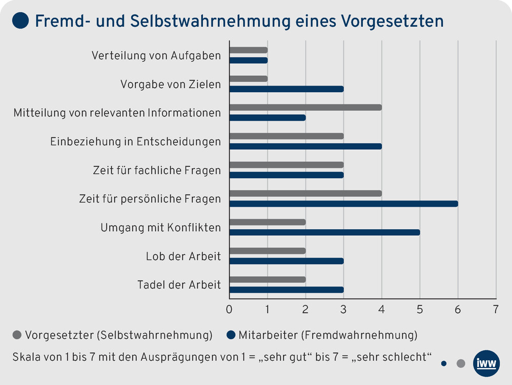 Wenn man nicht nur wissen möchte, wie Mitarbeiter und Vorgesetzte einander beurteilen, sondern auch, wie sie sich selbst beurteilen bzw. sehen, gelangt man zur Selbstwahrnehmung. Beispielsweise könnte man fragen: „Wie beurteilen Sie Ihr Führungsverhalten als Vorgesetzter?“ „Wie beurteilen Sie Ihr Verhalten als Mitarbeiter?“ Die Ergebnisse eröffnen die Möglichkeit, die Selbst- mit der Fremdwahrnehmung zu vergleichen. Als Ausgangspunkt für die weiteren Gespräche bietet es sich an, die Ergebnisse der Fremd- und Selbstwahrnehmung grafisch darzustellen, da Abweichungen und Übereinstimmungen so schnell erkennbar sind. Die folgende Grafik zeigt ein Beispiel für die Fremd- und Selbstwahrnehmung eines Vorgesetzten.