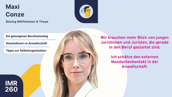 In Staffel 6 Folge 11 des Podcasts von Dr. Marie-These Boetzkes „Mit Jura kannst du alles machen!“: Cynthia-Sophie Pfalzgraf hat Jura studiert, das Ref durchgezogen, sogar promoviert – und sich dann gegen Anwaltsrobe, Justizkarriere und ...