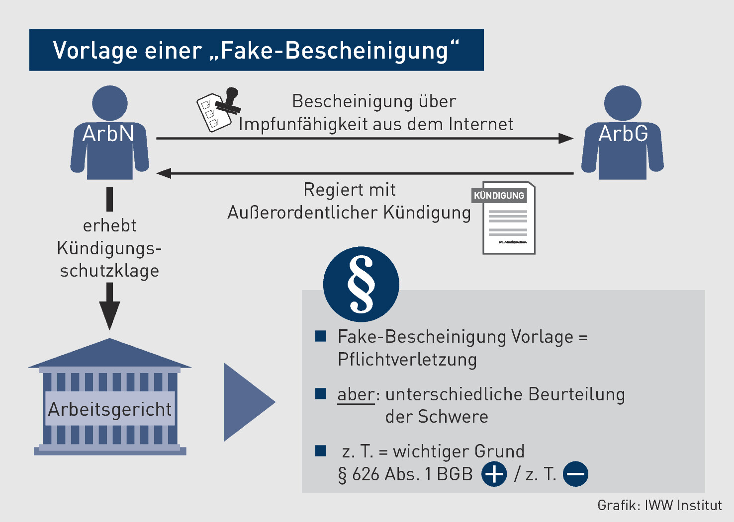 Die ArbN sind beim ArbG seit 1988 bzw. 2001 als Pflegeassistentin bzw. Krankenschwester beschäftigt und tariflich ordentlich unkündbar. Der ArbG wollte die einrichtungsbezogene Impfpflicht umsetzen und wies seine ArbN an, den Impf- bzw. Genesenenstatus nachzuweisen oder ein ärztliches Impfunfähigkeitszeugnis vorzulegen. Die ArbN haben daraufhin jeweils ein Schriftstück vorgelegt, das eine sechsmonatige vorläufige Impfunfähigkeit bescheinigt und die Unterschrift einer Ärztin ausweist. Die Bescheinigung wurde aus dem Internet ausgedruckt. Eine – sei es digitale – Besprechung mit der Ärztin fand nicht statt. Der ArbG informierte das Gesundheitsamt über die Vorgänge. Zudem kündigte er den ArbN fristlos, hilfsweise ordentlich.