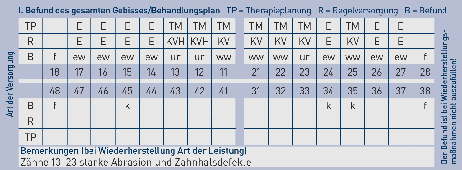 Bei einem GKV-Patienten aus Baden-Württemberg wurde ein BEMA-HKP mit Anlage für sieben verblendete Teleskopkronen und eine Modellgussprothese im Oberkiefer bei der Krankenkasse beantragt. Da für diese Versorgung eine Modellgussprothese vorgesehen war, fand sich im Bemerkungsfeld nur ein Hinweis auf Abrasionen und Zahnhalsdefekte. Die Krankenkasse genehmigte die Behandlungsunterlagen und der Patient wurde im Sommer 2022 versorgt.