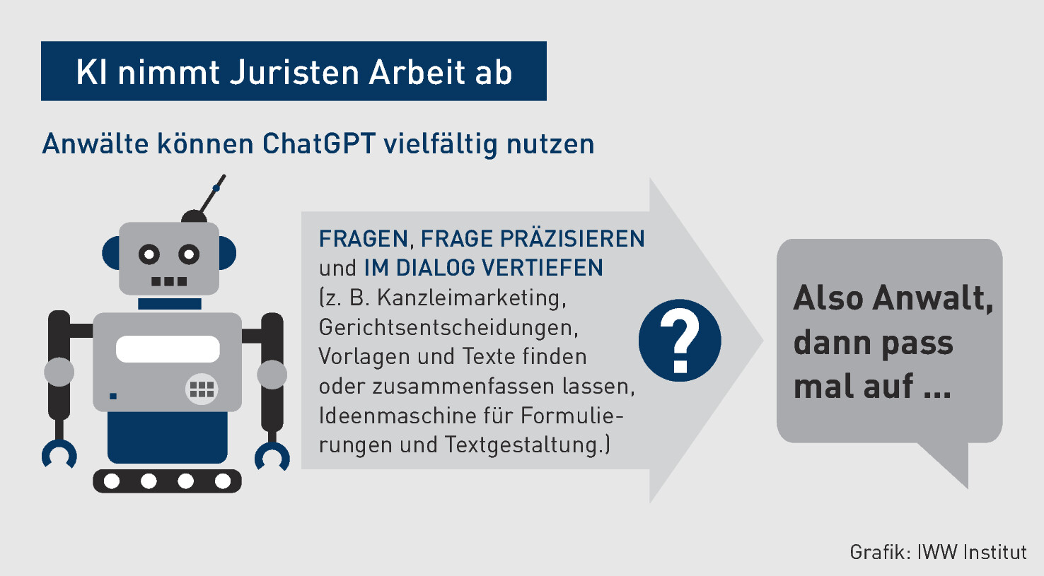 | Seitdem OpenAI seinen cleveren KI-Bot ChatGPT aus dem Entwicklerhut gezaubert hat, steht die digitale Welt Kopf. Der Wirtschaftsjurist Tom Braegelmann meinte im Handelsblatt, dass ChatGPT und vergleichbare Bots den Rechtsberatungsmarkt grundlegend verändern würden. Werden sie das wirklich? Rechtsanwalt Prof. Dr. Hans-Hermann Dirksen (iww.de/s8664) von LIEBENSTEIN LAW hat sich auf das Recht der Digitalisierung in der Industrie 4.0 und im HealthCare-Sektor spezialisiert. Er berät Mandanten, wenn Vertragswerke im Bereich IT/IP-Law und Neue Technologien geschrieben werden müssen. Im Interview erklärt er, was auf Anwälte mit ChatGPT zukommt und wo die Grenzen von KI-Tools verlaufen. |