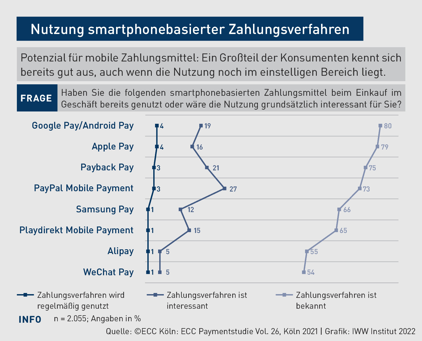 Auch am Point of Sale (PoS) haben die Wallet-Lösungen zulegen können. Zwar bezahlt bereits mehr als ein Drittel der deutschen Konsumenten kontaktlos an der Ladenkasse – das Smartphone spielt hierbei aber noch eine untergeordnete Rolle. Etwas mehr als jeder Vierte, der bereits kontaktlos bezahlt, nutzt hierfür das Smartphone oder die Smartwatch und damit ein digitales Wallet. So sind Google Pay und Apple Pay bei um die 80 % der Konsumenten bekannt, Payback Pay liegt bei einem Bekanntheitsgrad von 75 % und selbst Alipay aus China kennen mehr als die Hälfte der Konsumenten.