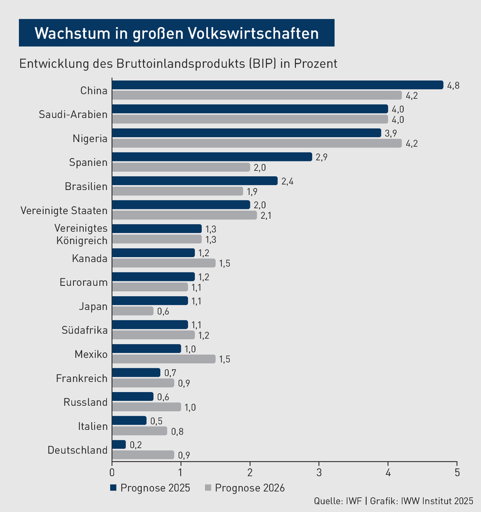 3,1 % Wachstum im kommenden Jahr – es geht aufwärts. Leider bezieht sich diese Zahl nicht auf Deutschland. Vor einigen Tagen legte der Internationale Währungsfonds (IWF) die neueste Ausgabe seines halbjährlichen Weltwirtschaftsausblicks vor. Darin korrigiert der IWF seine weltweite Wachstums-prognose für 2026 leicht nach oben, auf eben jene 3,1 %. Deutschland trägt derzeit jedoch nur sehr wenig zum weltweiten Wachstum bei. Für das laufende Jahr prognostizieren die IWF-Fachleute lediglich ein Wachstum des Bruttoinlandsprodukts von 0,2 %, für 2026 eines von 0,9 % (vgl. auch die folgende Grafik). „Unter den großen Industrienationen wird das bisherige Wachstumsschlusslicht Deutschland auch 2026 kaum über die Abstiegsränge hinauskommen“, kommentiert z. B. die „Süddeutsche Zeitung“ (Hulverscheidt, Claus, 14.10.25, IWF dämpft die deutschen Wachstumshoffnungen).