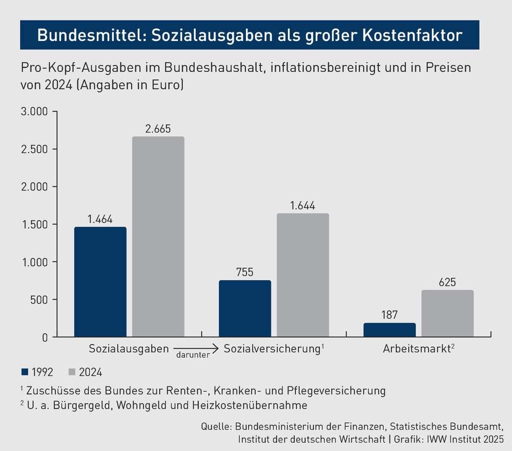Während die USA um über 12, Frankreich um 5 und Italien um 6 % gewachsen sind, schrumpfte die deutsche Wirtschaft zuletzt sogar. Selbst Nachbarn wie die Niederlande, Dänemark oder die Schweiz konnten ihre Wirtschaftsleistung seit dem Jahr 2000 um bis zu 57 % steigern – Deutschland kam nur auf 29 % (vgl. Grimm, Veronika, Haucap, Justus, Kolev, Stefan, Wieland, Volker: Eine Wachstumsagenda für Deutschland. Gutachten des wissenschaftlichen Beraterkreises für evidenzbasierte Wirtschaftspolitik beim Bundesministerium für Wirtschaft und Energie, Berlin 27.9.25, www.iww.de/s14716). Der Wachstumsrückstand Deutschlands ist strukturell bedingt. Während die industrielle Wertschöpfung abnimmt, wächst der Dienstleistungssektor insbesondere im öffentlichen Bereich, in dem kaum Produktivitätsfortschritte erzielt werden. Laut Sachverständigenrat hat das Wachstumspotenzial einen historischen Tiefstand erreicht.