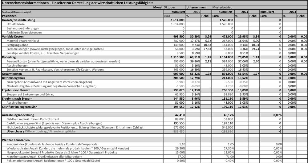 Die Gliederung des Einseiters orientiert sich an der klassischen BWA, jedoch sind zahlreiche Positionen zusammengefasst, um die Übersichtlichkeit zu erhöhen. Im oberen Bereich werden allgemeine Daten eingetragen, z. B. zu den Darstellungszeiträumen. Bei der Gesamtleistung können sowohl Umsätze als auch Bestandsveränderungen oder aktivierte Eigenleistungen eingegeben werden. Bei Unternehmen, die nur Umsatzerlöse ausweisen, können die beiden letzten Positionen durch einen Klick auf das „–“ ausgeblendet werden. Bei den variablen Kosten können Materialkosten, Fertigungslöhne, auftragsbezogene Fremdleistungen und sonstige variable Kosten eingegeben werden. So erhält man einen genaueren Rohertrag, der ausreichen muss, um die restlichen Kosten zu decken und den gewünschten Gewinn zu erzielen. Wenn der Ausweis von Löhnen, Fremdleistungen und sonstigen variablen Kosten nicht gewünscht oder möglich ist, können diese Positionen hier ausgeblendet werden. Bei den Gesamtkosten werden nur die Personalkosten, die Abschreibungen und die sonstigen Kosten ausgewiesen. Die Personalkosten werden ausgewiesen, da sie i. d. R. die größte Position darstellen, die Abschreibungen, da sie für die spätere Berechnung des Cashflows benötigt werden. Alle anderen Kosten werden unter „sonstige Kosten“ zusammengefasst.