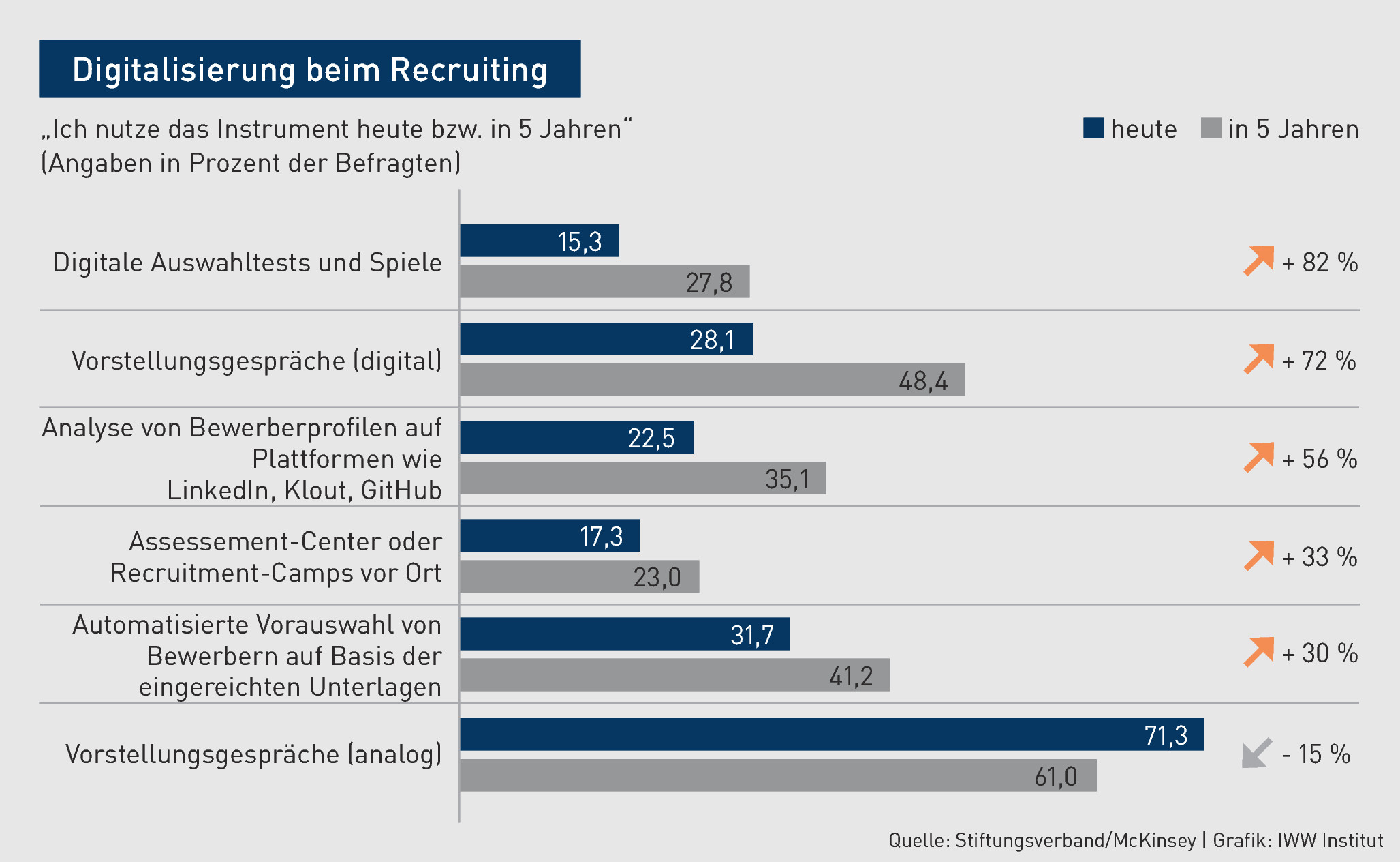 CE_Grafik_Digitalisierungstrend beim Recruiting.eps (Bild: Quelle: Stiftungsverband/McKinsey | Grafik: IWW Institut)
