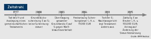 In der Folgezeit führten der beschenkte Sohn und seine Brüder einen Zivilrechtsstreit, in dem es darum ging, ob aus den §§ 2113, 2287 BGB ein Anspruch auf Rückübertragung von Miteigentumsanteilen oder auf Wertersatz in Geld bestehen könnte. Dieser Rechtsstreit wurde durch einen Vergleich beendet, aufgrund dessen der beschenkte Sohn an einen seiner Brüder 150.000 EUR zur Abgeltung aller Ansprüche im Jahr 2015 zahlte.