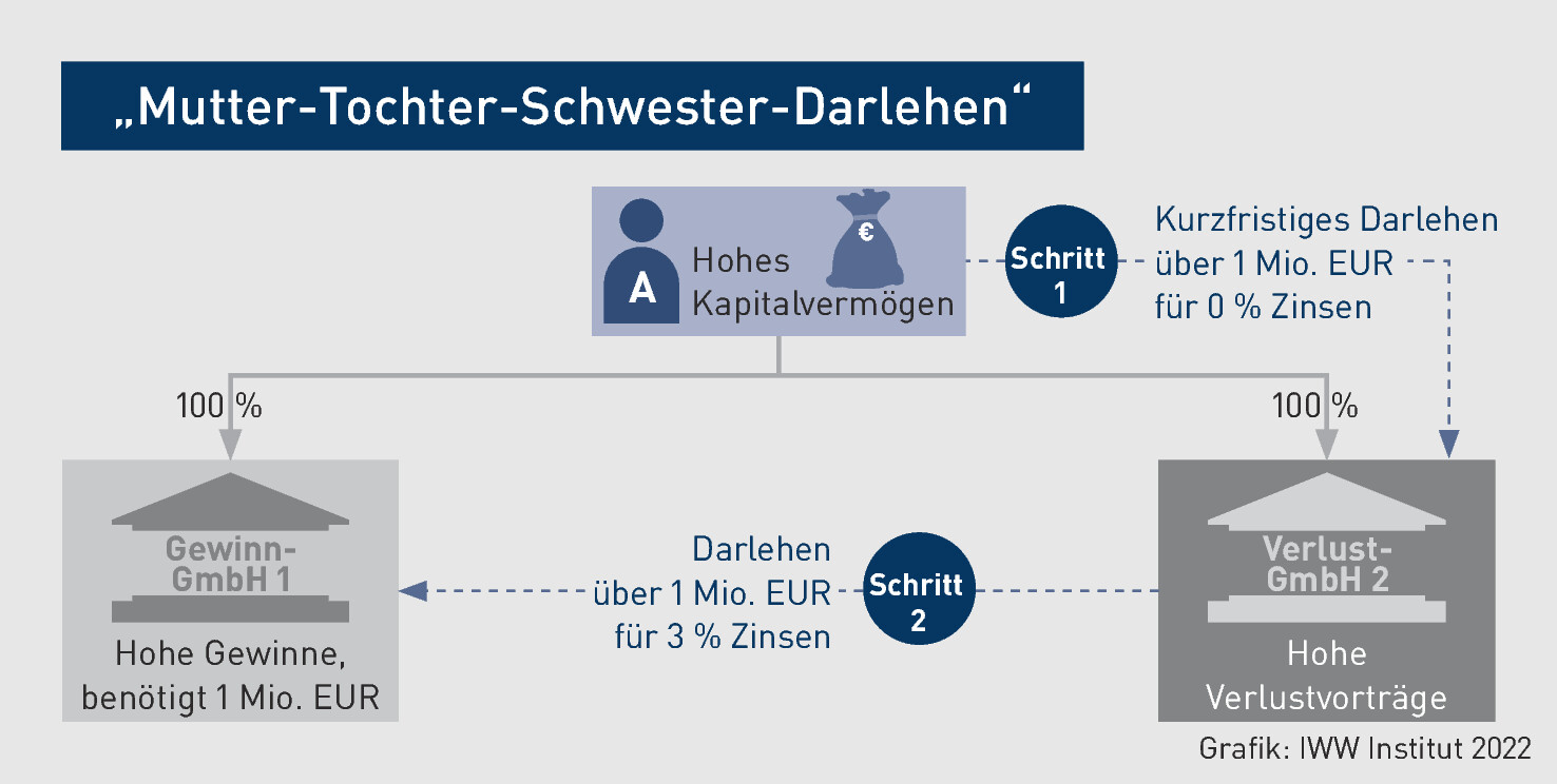 Bei geschickter Gestaltung gelingt es, beide Ziele gleichermaßen zu erreichen. Dazu stellt der Gesellschafter A zunächst seiner Verlust-GmbH 2 ein Darlehen in Höhe von 1 Mio. EUR zur Verfügung. Dieses ist kurzfristig fällig und wird vertraglich vereinbart nicht verzinst. Im Anschluss gewährt die Verlust-GmbH 2 der Gewinn-GmbH 1 ebenfalls ein Darlehen in Höhe von 1 Mio. EUR. Hier wird jedoch ein Zinssatz von jährlich 3 % (in Anlehnung an das Bankdarlehen) vereinbart.