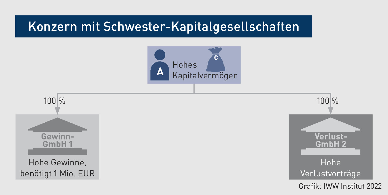 A verfügt über hohes Privatvermögen. Zudem ist er Alleingesellschafter von zwei Kapitalgesellschaften. Bei der Gewinn-GmbH 1 laufen die Geschäfte gut – sie erzielt hohe Gewinne. Allerdings benötigt sie für den Ausbau der Produktion frisches Kapital i. H. v. 1 Mio. EUR. Soll A ihr zur Finanzierung ein Darlehen gewähren? Bei der Verlust-GmbH 2 sieht es dagegen nicht so gut aus. Die GmbH steht zwar nicht kurz vor der Insolvenz, aber es haben sich in den vergangenen Jahren hohe Verlustvorträge angesammelt. A fragt sich, wie er diese Verluste steuerlich nutzen kann. Eine Verschmelzung kommt für A nicht infrage, da er die Gesellschaften weiterhin voneinander trennen möchte.
