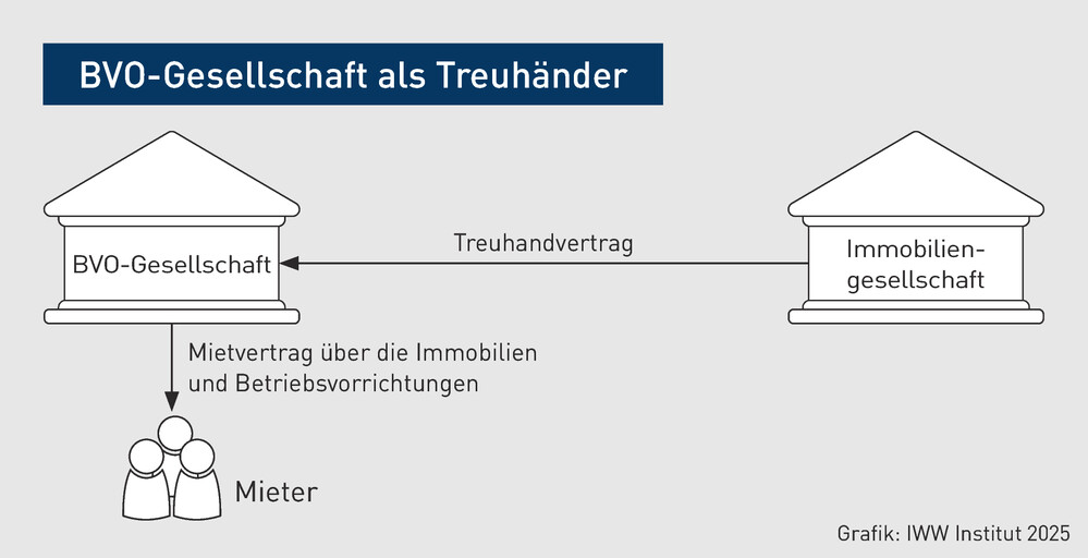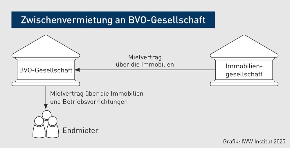 Eine weitere Möglichkeit besteht darin, dass im Außenverhältnis die BVO-Gesellschaft als Vermieterin auftritt. Diese mietet die Immobilien gruppenintern von der Immobiliengesellschaft an und überlässt diese im Außenverhältnis zusammen mit den Betriebsvorrichtungen den Mietern. Im Außenverhältnis wird somit nur ein Vertrag mit dem Mieter der Immobilie geschlossen.
