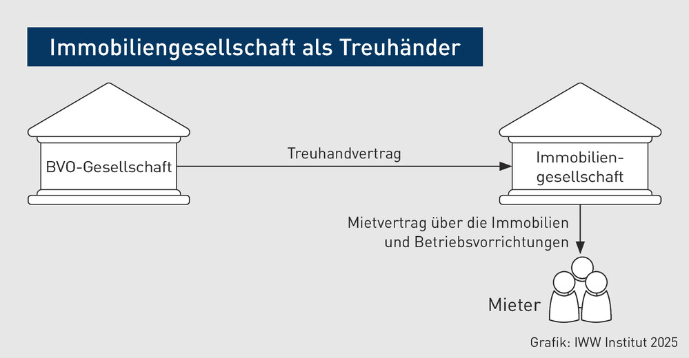 Das Modell hat den Vorteil, dass die Immobiliengesellschaft keine Dienstleistungen für die BVO-Gesellschaft (in Form von Treuhand- und Inkassotätigkeiten) erbringt und sich ihre Tätigkeiten auf die reine Verwaltung ihres Grundbesitzes beschränken. Die BVO-Gesellschaft tritt insoweit lediglich als Dienstleister für die Immobiliengesellschaft auf. Zudem wird u. E. der Nachteil der gewerbesteuerlichen Hinzurechnung gemäß § 8 Nr. 1 Buchst. e GewStG vermieden, da die Immobiliengesellschaft den Grundbesitz nicht an die BVO-Gesellschaft vermietet.
