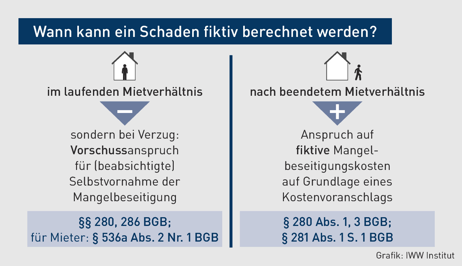 Danach können Ansprüche auf Schadenersatz statt der Leistung auf der Grundlage der für eine Instandsetzung/-haltung oder für den Rückbau der Mietsache erforderlichen, aber (noch) nicht aufgewendeten („fiktiven“) Kosten berechnet werden (BGH 12.3.14, XII ZR 108/13; 5.3.14, VIII ZR 205/13; 8.1.14, XII ZR 12/13; 20.10.04, VIII ZR 378/03).