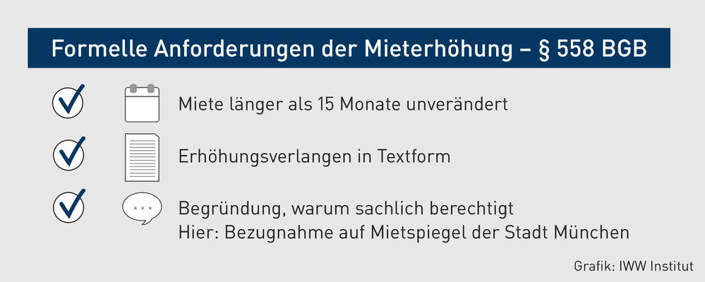 Das Erhöhungsverlangen der Klägerin wird den formellen Anforderungen an eine Mieterhöhung gerecht. Die begehrte Erhöhung der Nettomiete zum 1.1.22 um insgesamt 124,86 EUR wird hinsichtlich des Mietanteils für die streitgegenständliche Wohnung unter Bezugnahme auf den Mietspiegel der Stadt München für das Jahr 2021 begründet, bei dem es sich um ein gemäß § 558a Abs. 2 Nr. 1 BGB zulässiges Begründungsmittel handelt.