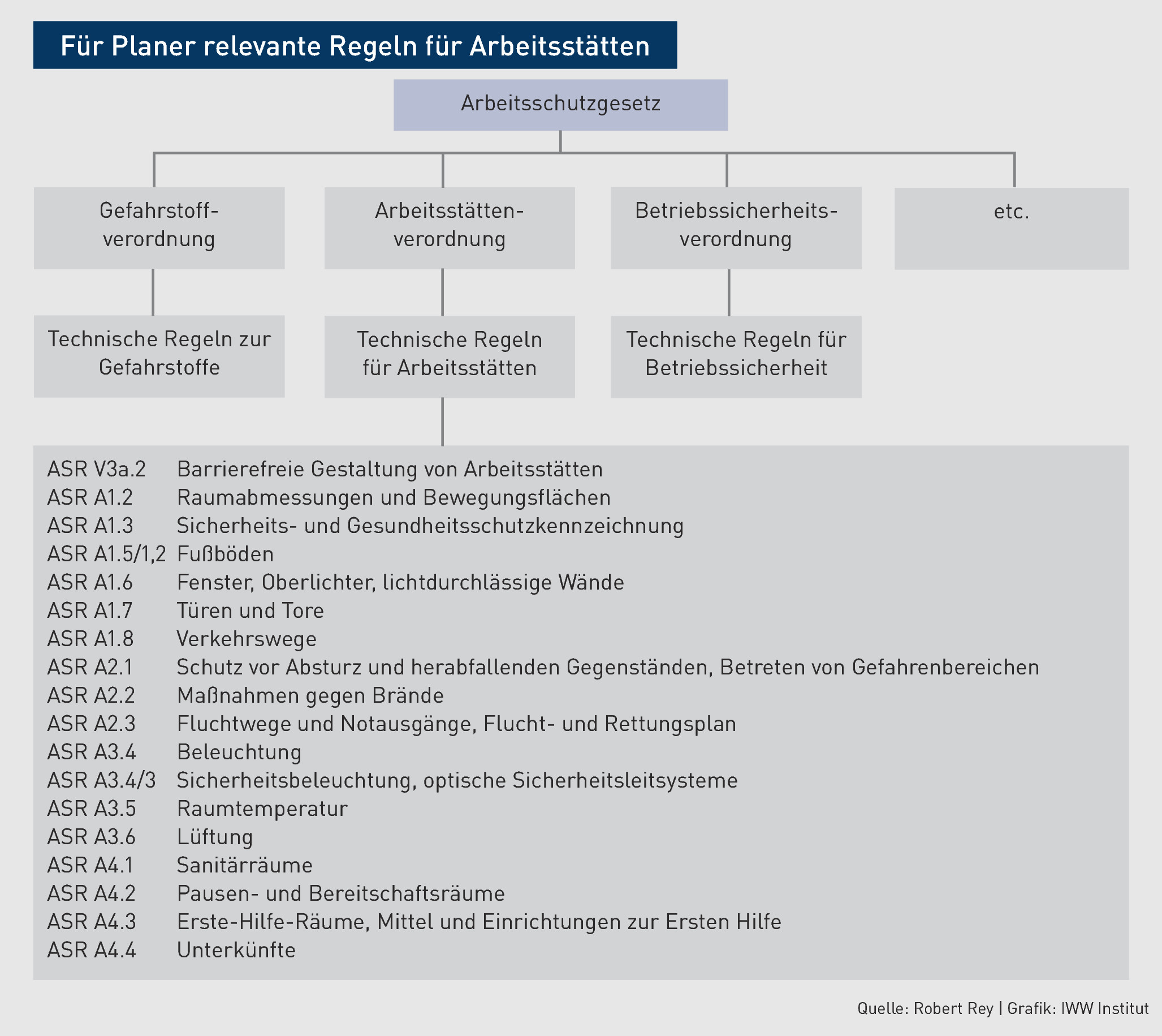Wichtig | Es ist damit zu rechnen, dass die neue ArbStättV dazu führt, dass auch die technischen Regeln für Arbeitsstätten in Kürze überarbeitet werden. Halten Sie sich also diesbezüglich auf dem Laufenden. In der folgenden Grafik sind technische Regeln aufgelistet, die eine große Schnittmenge mit den Handlungsfeldern der planenden Berufe haben.