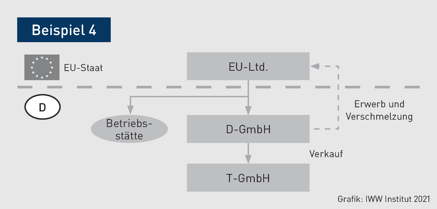 Sachverhalt grundsätzlich wie in Beispiel 3. Nunmehr werden in der inländischen Betriebsstätte der EU-Ltd. jedoch signifikante Gewinne erzielt. Die D-GmbH erwirbt im Januar 2021 die Anteile an der inländischen T-GmbH. Diese unterliegen annahmegemäß den Vorschriften des § 8b Abs. 7 und 8 KStG. Im April 2021 erwirbt die EU-Ltd. die Anteile an der D-GmbH von einem fremden Dritten. Im Juni 2021 veräußert die D-GmbH die Anteile an der T-GmbH unter Realisierung großer stiller Lasten, folglich entsteht ein erheblicher steuerlicher Verlust. Schließlich wird mit zivilrechtlicher Wirkung zum 15.12.21 die D-GmbH upstream auf die EU-Ltd. verschmolzen (steuerlicher Übertragungsstichtag 31.12.20).