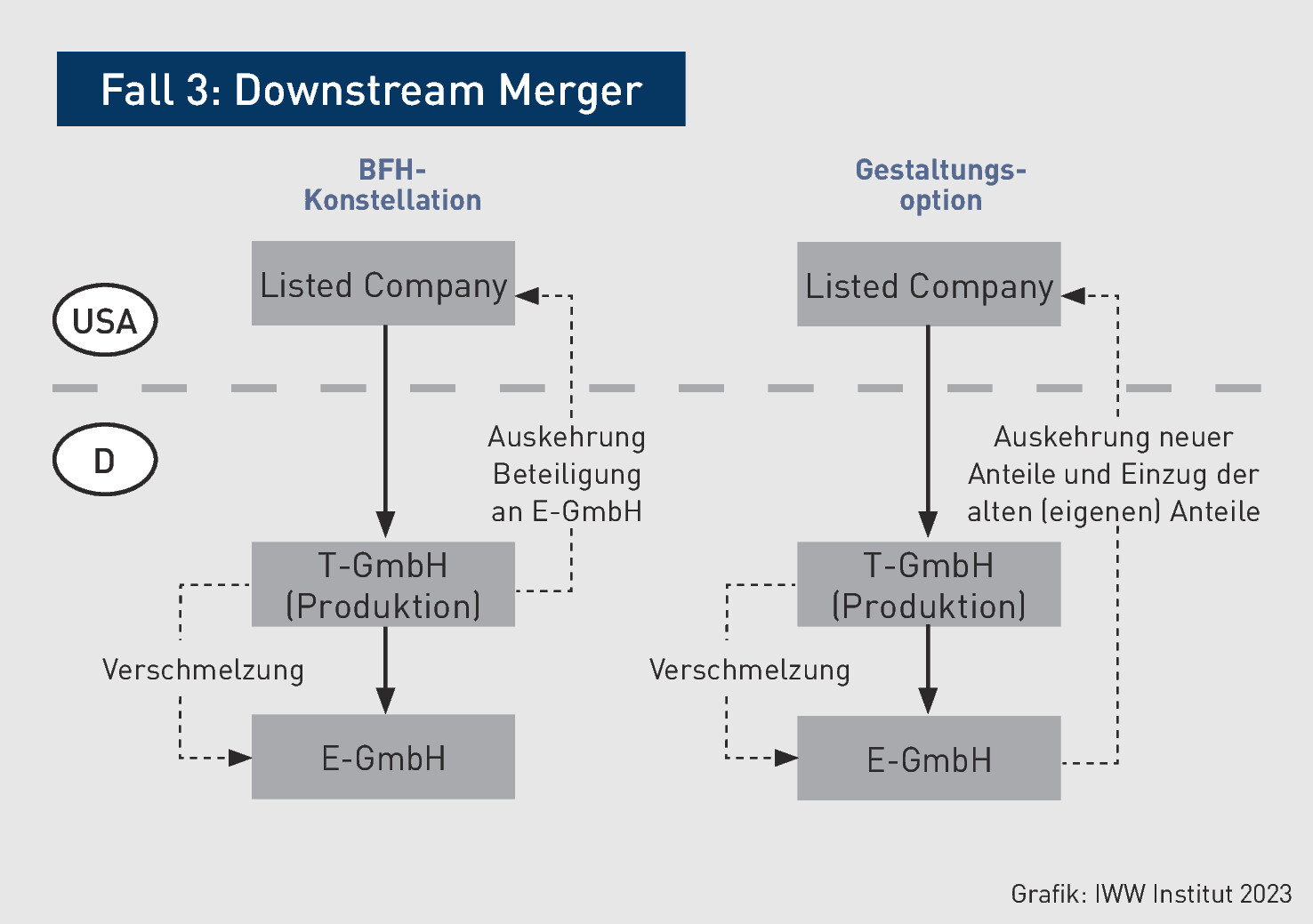 Die US-amerikanische börsennotierte M-Corporation-Gruppe ist ein globaler Player mit weltweiten Produktionsstätten und Vertriebseinheiten. Zur M-Corporation-Gruppe gehören auch zwei Gesellschaften in Deutschland, die T-GmbH sowie die E-GmbH. Zum 31.12.17 als steuerlichem Übertragungsstichtag wird die deutsche T-GmbH downstream auf die E-GmbH verschmolzen, wobei die Beteiligung an der E-GmbH indes an die US-amerikanische Anteilseignerin der T-GmbH ausgekehrt wurde. Mit Blick auf die zu diesem Zeitpunkt vorliegenden überzeugenden FG-Urteile (FG Düsseldorf 22.4.16, 6 K 1947/14 K, G und FG Rheinland-Pfalz 12.4.16, 1 K 1001/14) wird auch für das Wirtschaftsgut „Beteiligung an der E-GmbH“ der Buchwertansatz gemäß § 11 Abs. 2 S. 2 UmwStG gewählt und entsprechend veranlagt.
