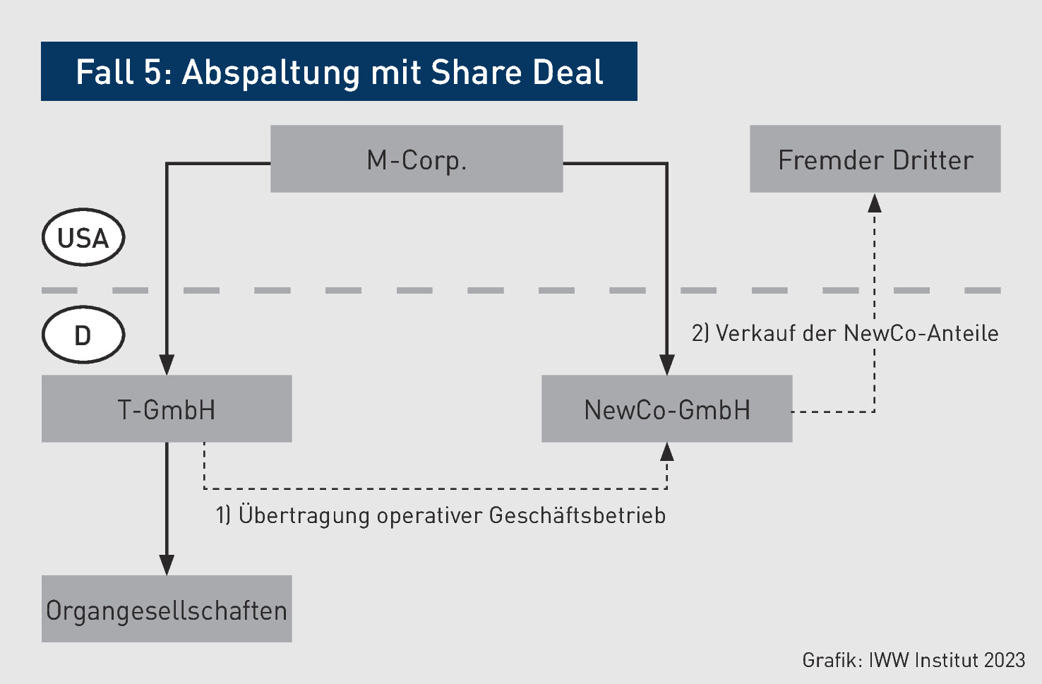 Die US-amerikanische M-Corporation hält 100 % der deutschen Tochter-GmbH, welche neben einem operativen Geschäftsbetrieb auch als Organträger für zahlreiche deutsche Organgesellschaften fungiert. Zum 31.12.19 erfolgte mit steuerlicher Rückwirkung die Abspaltung des operativen Geschäftsbetriebs auf eine NewCo-GmbH steuerneutral zum Buchwert. Noch im Jahr 2020 kurz nach der Eintragung der Abspaltung im Handelsregister erfolgte der Verkauf der Anteile der NewCo-GmbH durch die M-Corporation.
