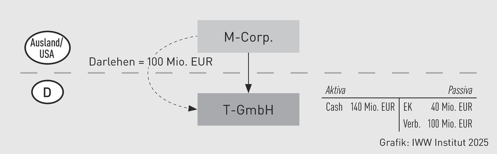 Die in den USA ansässige Muttergesellschaft (M-Corp.) hat in 2021 ein Darlehen i. H. v. 100 Mio. EUR mit einer zehnjährigen Laufzeit an eine deutsche Tochtergesellschaft zu einem fremdvergleichskonformen Zinssatz von 3 % vergeben, welches in EUR valutiert. Im Zeitpunkt der Ausreichung war das Darlehen annahmegemäß voll werthaltig. Die T-GmbH erwirtschaftet darüber hinaus seit Jahren konstante Gewinne, sodass Ende 2024 ein positives Eigenkapital bestand. Im Dezember 2024 führte die M-Corp. im Rahmen einer Rekapitalisierungsmaßnahme einen vollumfänglichen expliziten, d. h. offenen Forderungsverzicht durch. Aufgrund der Zinspolitik der FED und EZB ist es allerdings zu einem Anstieg des allgemeinen Zinsniveaus gekommen, sodass für ein vergleichbares Darlehen mit einer Restlaufzeit von sieben Jahren im Zeitpunkt des Forderungsverzichts ein Zinssatz von 6 % unter Fremdvergleichsgesichtspunkten einschlägig gewesen wäre.