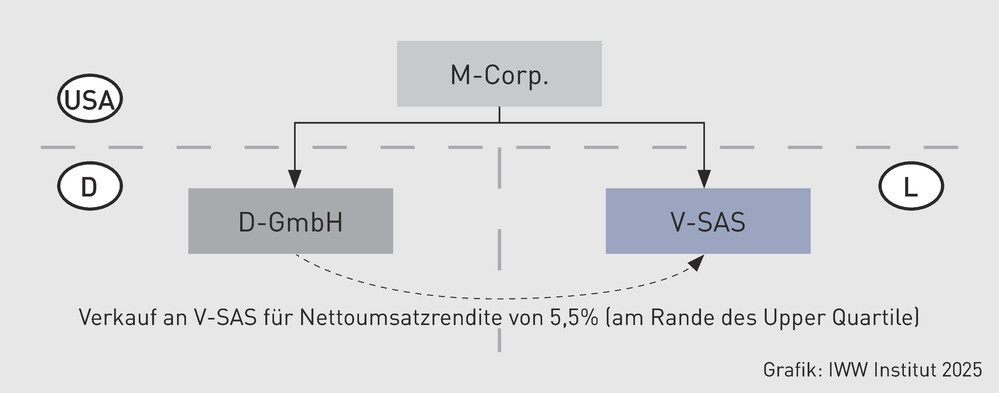 Die US-amerikanische börsennotierte M-Corp.-Gruppe umfasst die D-GmbH, die Sportgeräte herstellt und unter anderem an die verbundene Vertriebsgesellschaft V-SAS in Luxemburg liefert. Die Verrechnungspreisanalyse zwischen der D-GmbH und der V-SAS folgt den in den OECD-Verrechnungspreisrichtlinien vorgesehenen Schritten einer Vergleichbarkeitsanalyse. Auf Grundlage der Funktions- und Risikoanalyse wurde die V-SAS aufgrund ihrer Tätigkeiten, Risiken und eingesetzten Vermögenswerte als Routinegesellschaft (Limited Risk Distributor) eingestuft. Daher wurde die Nettomargenmethode (TNMM) als geeignetste Verrechnungspreismethode gewählt. Mithilfe einer Datenbankstudie wurden vergleichbare unabhängige Unternehmen identifiziert, und auf dieser Basis ergab sich eine fremdvergleichskonforme Interquartilsbandbreite der Nettoumsatzrenditen von 2,1 % (Lower Quartile) bis 5,6 % (Upper Quartile), mit einem Median von 3,5 %.