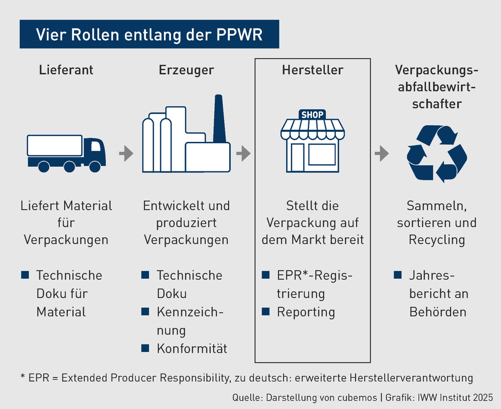 Die PPWR vereinheitlicht EU-weit den gesamten Lebenszyklus von Verpackungen – vom Design über das Inverkehrbringen bis zu Sammlung, Verwertung und Kennzeichnung. Hauptadressat ist der „Hersteller“, also der Wirtschaftsakteur, der Verpackungen erstmals in Verkehr bringt oder einführt. Auch „Erzeuger“ und „Lieferanten“ sind über Nachweis- und Konformitätspflichten in die Verantwortungskette eingebunden.