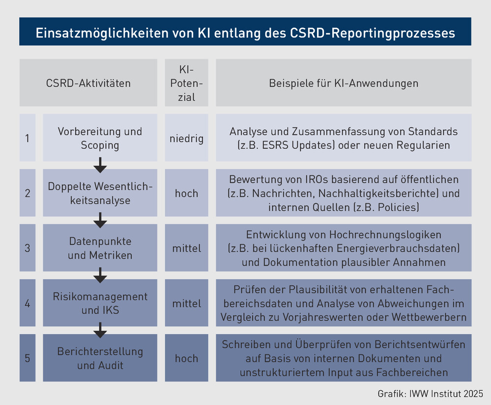 Laut IDW nutzen 37 % der deutschen Unternehmen bereits KI – bei großen Firmen sind es sogar 66 % (www.iww.de/s14561). Allerdings erfolgt der Einsatz in Reportingprozessen meist punktuell und selten systematisch. Fehlendes Know-how und rechtliche Unsicherheiten bremsen laut Statistischem Bundesamt die weitergehende Nutzung von KI (www.iww.de/s14562). Die Frage bleibt: Treibt KI die Nachhaltigkeitsberichterstattung voran – oder gefährdet sie Glaubwürdigkeit und Transparenz?