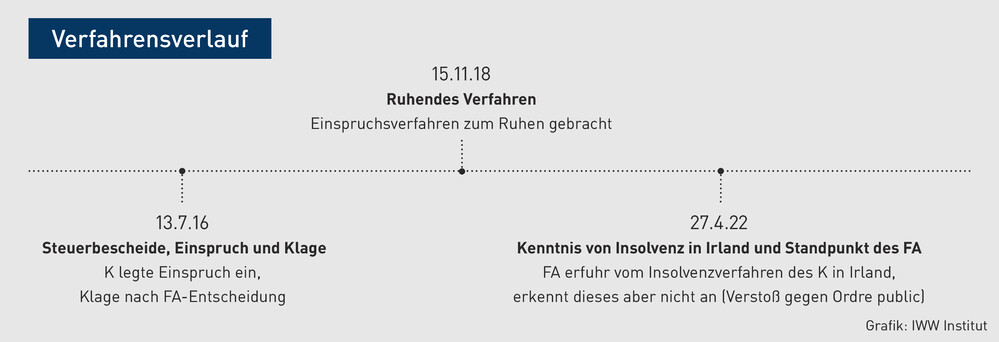 B erließ nach einer Außenprüfung bei K Steuerbescheide. K legte hiergegen am 13.7.16 Einspruch ein und erhob Klage, nachdem das FA hierüber entschieden hatte. Zwischenzeitlich hatte das FA mit Einverständnis des K durch Schreiben vom 15.11.18 die Einspruchsverfahren betreffend mehrerer Steuerbescheide zum Ruhen gebracht. Nachdem das FA durch Schriftsatz des K vom 27.4.22 von der Eröffnung des Insolvenzverfahrens in Irland erfuhr, erkannte es dieses nicht an, da K darin seine Schulden gegenüber dem FA verschwiegen habe. Denn B sei entgegen Art. 54 der VO (EU) 2015/848 des Europäischen Parlaments und des Rates vom 20.5.15 über Insolvenzverfahren (VO [EU] 2015/848) nicht angehört worden und habe deshalb seine Rechte als Gläubiger in jenem in Irland geführten Verfahren nicht wahrnehmen können. Die ruhenden Einspruchsverfahren seien wieder aufzunehmen. Nach Ansicht des FA liegt ein Verstoß gegen die deutsche öffentliche Ordnung („ordre public“) i. S. v. § 343 Abs. 1 S. 2 Nr. 2 InsO vor mit der Folge, dass das Insolvenzverfahren in Irland entgegen § 343 Abs. 1 S. 1 InsO nicht anzuerkennen sei. Dieses Insolvenzverfahren habe daher auf die ruhenden Einspruchsverfahren keinen Einfluss.