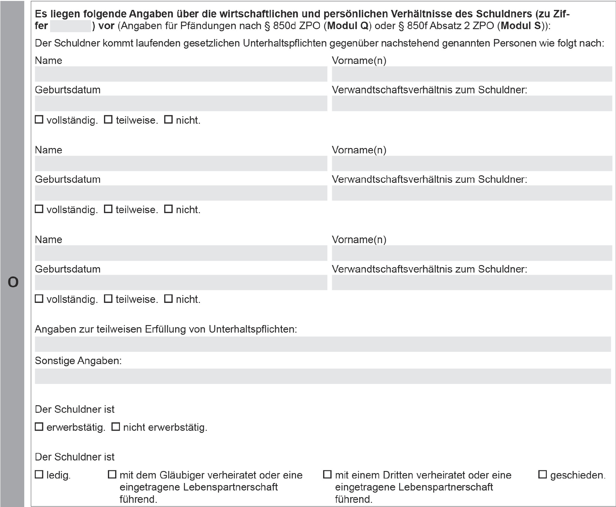 Beachten Sie | Die Angaben sind von Bedeutung, wenn im Formular der Anlage 5 das Kontrollkästchen in Modul Q bei Pfändungen wegen Unterhaltsansprüchen nach § 850d ZPO oder in Modul S bei Pfändungen wegen Forderungen aus einer vorsätzlich begangenen unerlaubten Handlung nach § 850f Abs. 2 ZPO (Deliktsforderungen) markiert wird. Im Modul O kann nämlich angegeben werden, ob der Schuldner seinen laufenden gesetzlichen Unterhaltspflichten vollständig, teilweise oder nicht nachkommt.