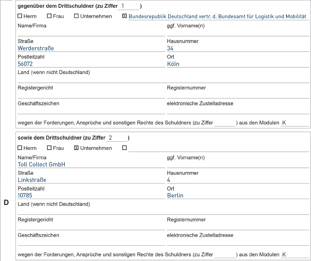 Beachten Sie | Das BVerwG (4.8.10, 9 C 6/09) hat bestätigt, dass der Betreiber ein umfassendes Zahlungsverpflichtungsverhältnis innehat, das ihn als Drittschuldner qualifiziert. Damit ist der Mautbetreiber im Pfändungsverfahren genauso Drittschuldner wie das Bundesamt für Logistik und Mobilität. Im Antrag auf Erlass eines PfÜB sollten daher vorsichtshalber beide Drittschuldner aufgeführt werden!