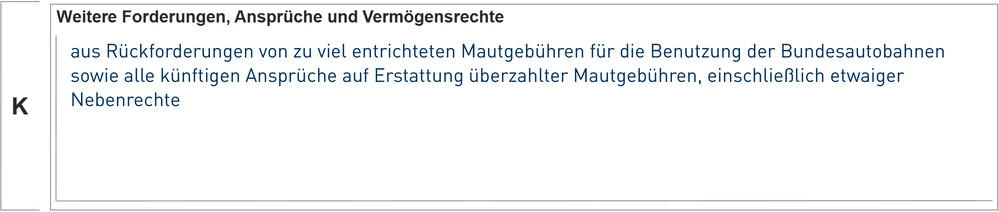 - Insolvenzverfahren: Wenn ein Schuldner insolvent ist, können Gläubiger im Rahmen des Insolvenzverfahrens Ansprüche anmelden und prüfen. Dort sind Angaben zu Forderungen, Erstattungen und Vermögenswerten offenzulegen. Der Schuldner muss dem Insolvenzverwalter gegenüber Mauterstattungsansprüche angeben (§ 20 Abs. 1 InsO). Dieser verwertet die Ansprüche für die Gläubigergemeinschaft. Dadurch kann die einzelne Quote erhöht werden.